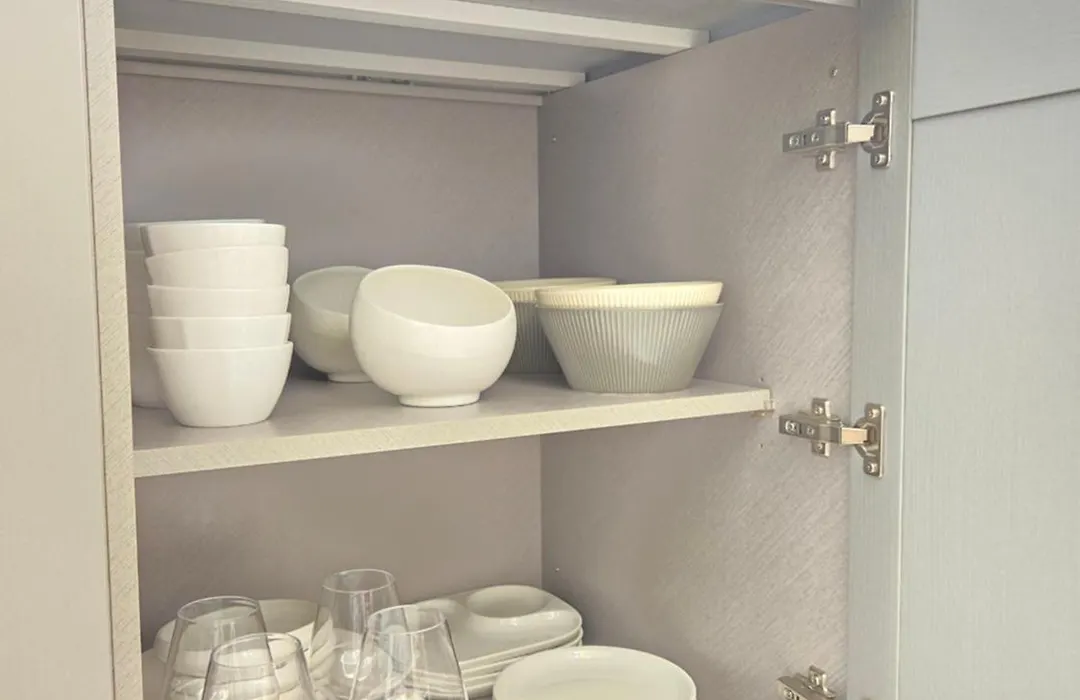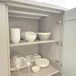 Among the self-catering amenities provided is a kitchen with a fridge and glassware.